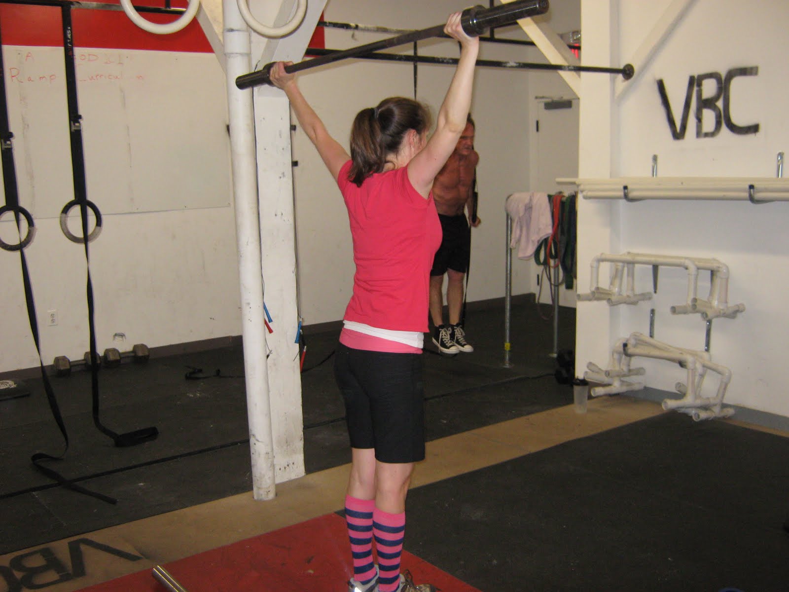 Everything is scaleable within CrossFit… Joanna subbing in Parallete PVC Dips for Ring Dips…Increase the Range of Motion by stacking weights…