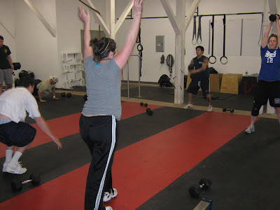 Kevin’s Notes: In this workout you move from each of five stations after a minute. This is a five-minute round from which a one-minute break is allowed before repeating. The clock does not reset or stop between exercises. On call of “rotate,” the athlete/s must move to next station immediately for good score. One point is given for each rep, except on the rower where each calorie is one point. Guys will use 18%-22% of Bodyweight. Gals will use 15%-17% of Bodyweight for Dumbbell Thrusters.